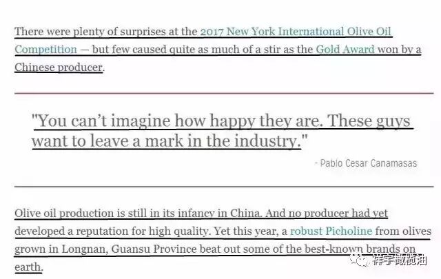 譯文:在2017屆紐約國際橄欖油大賽上驚喜不斷,但卻未曾出現過中國原產的橄欖油獲得金獎這樣的轟動。